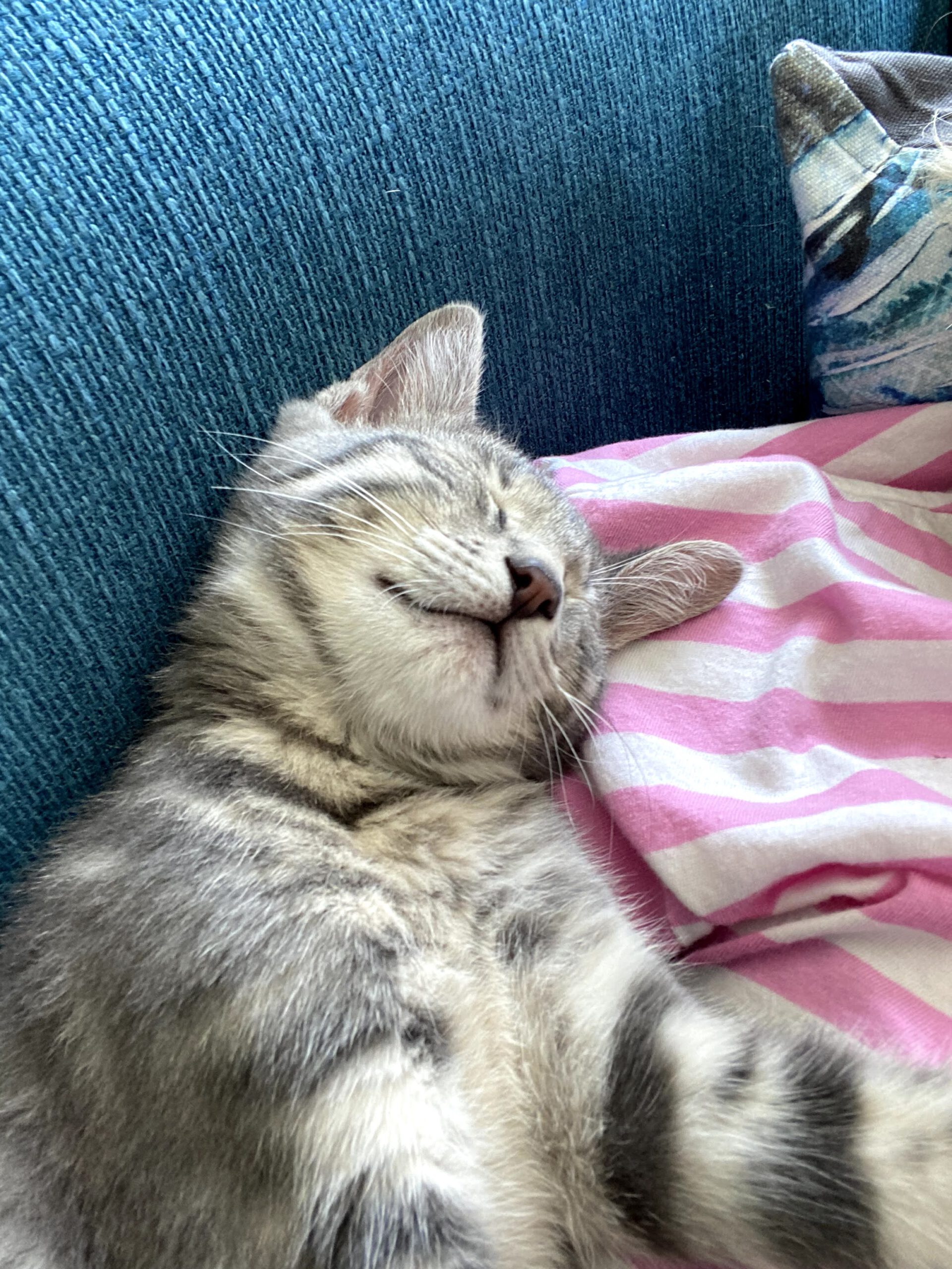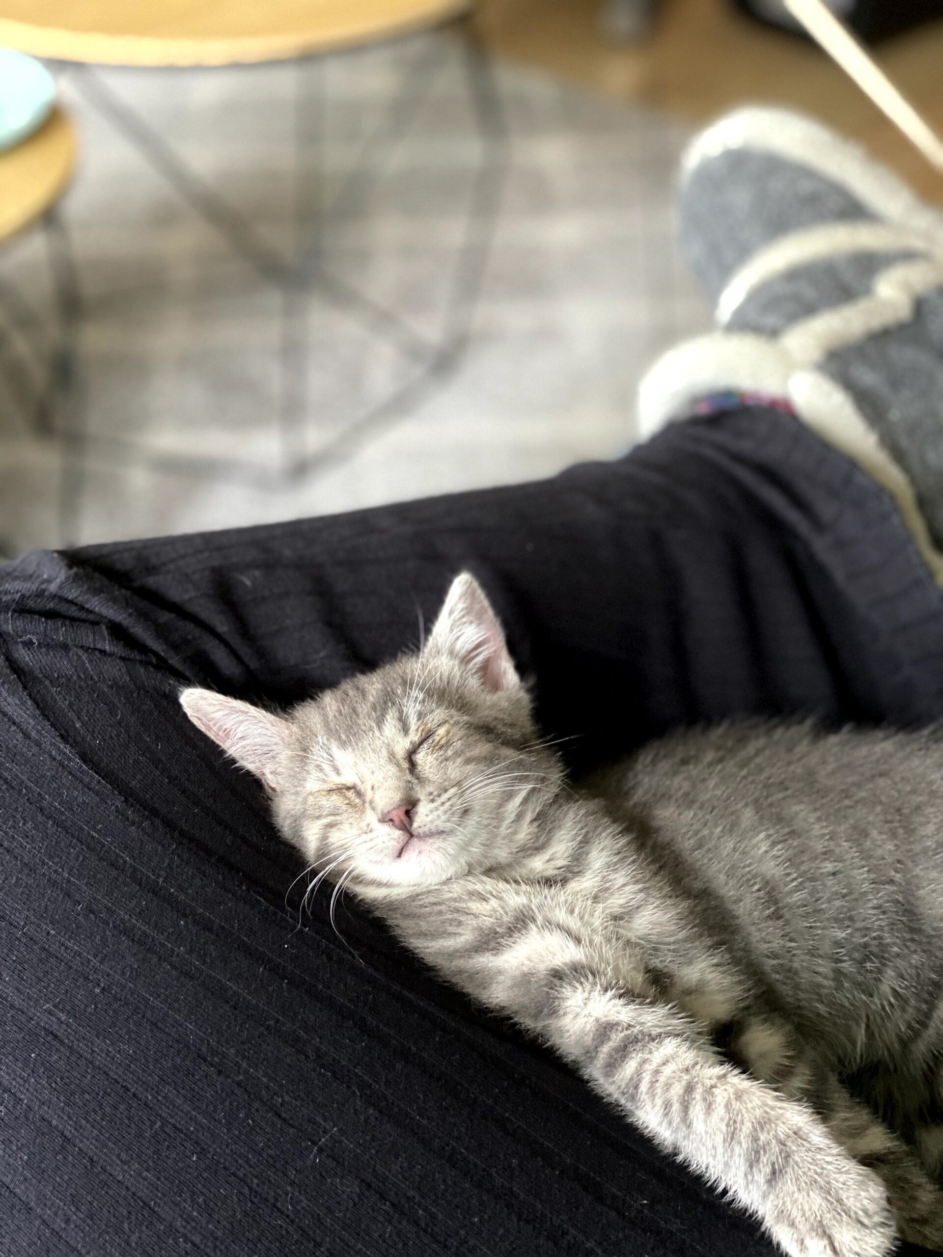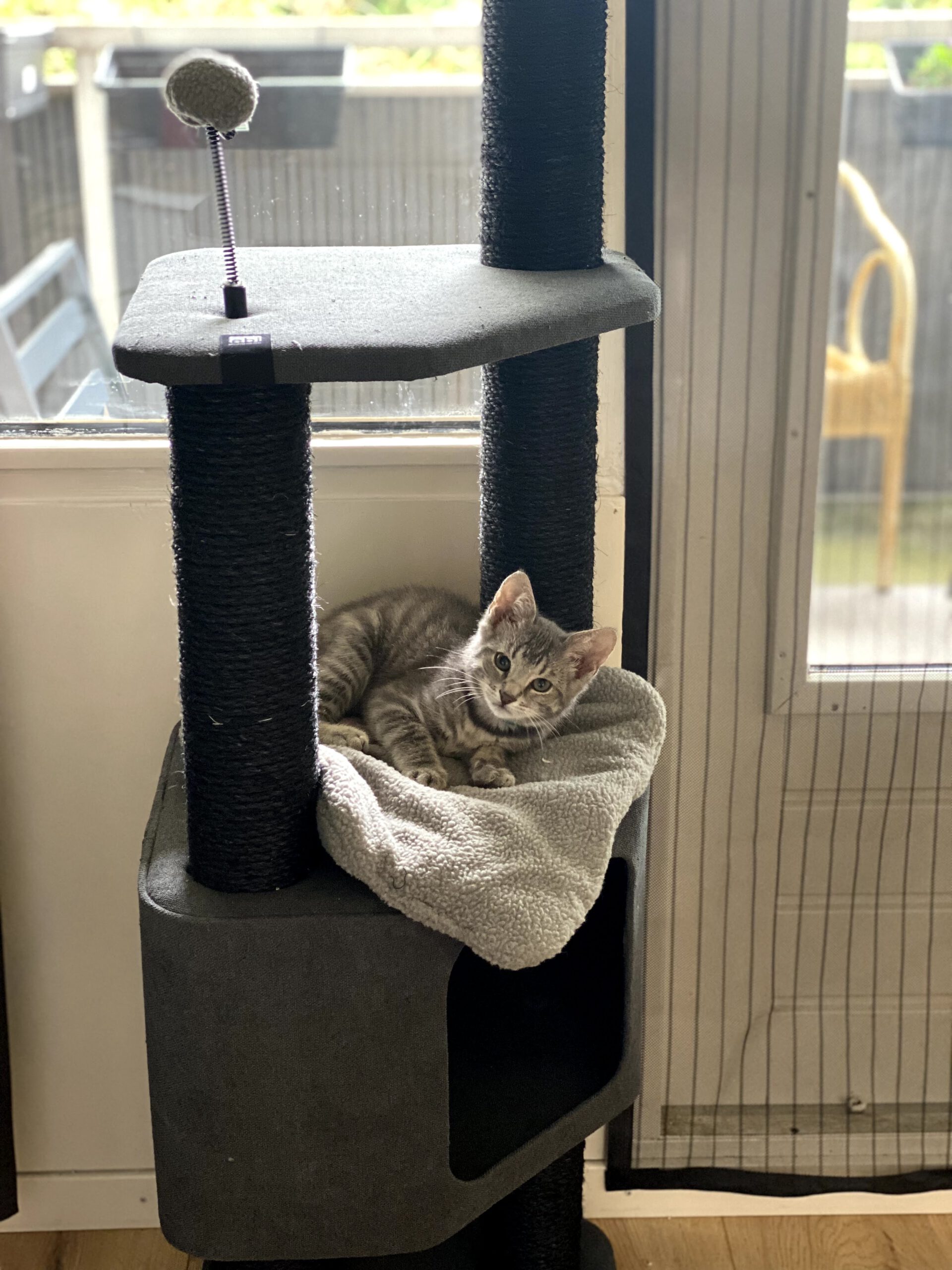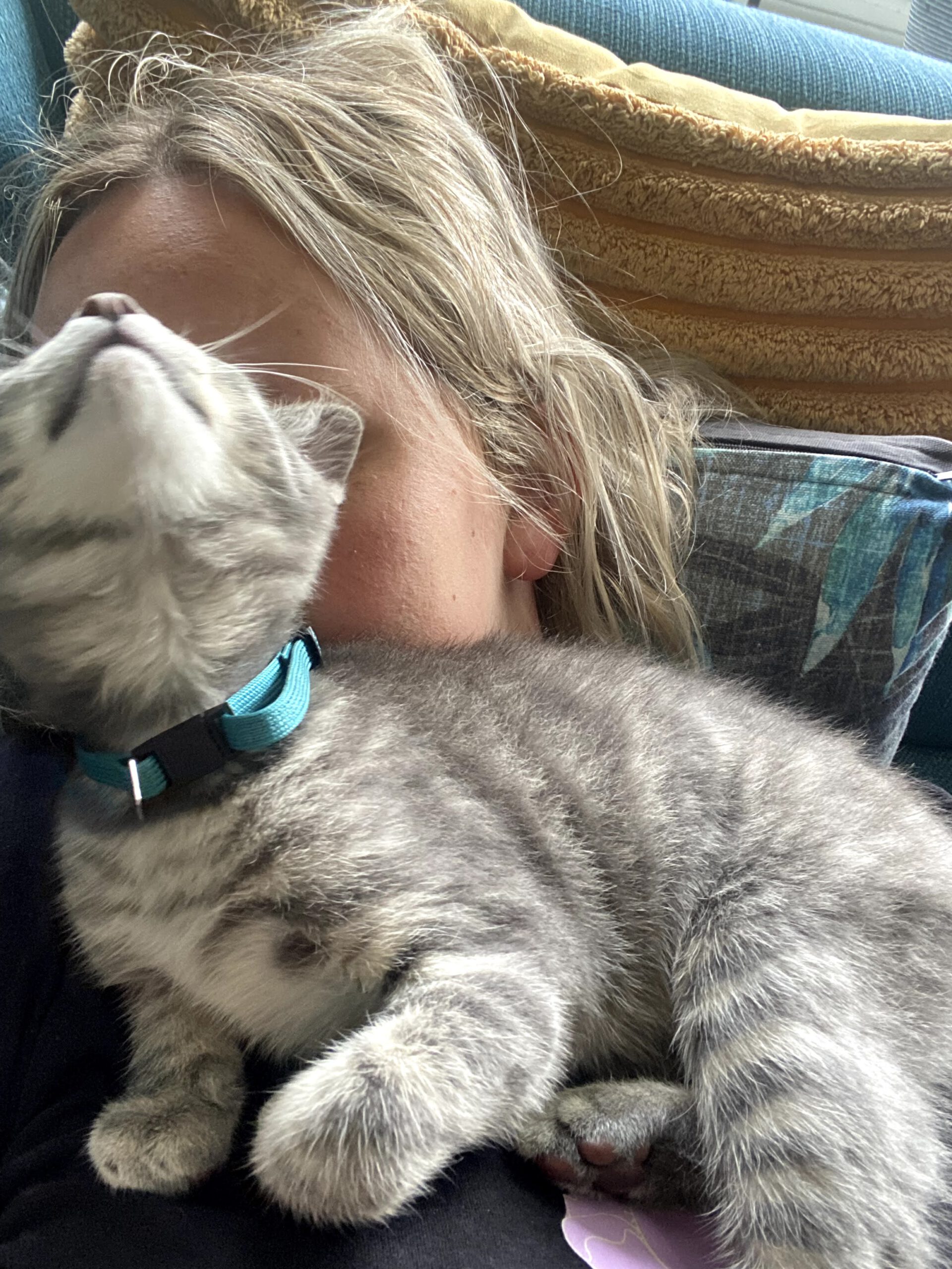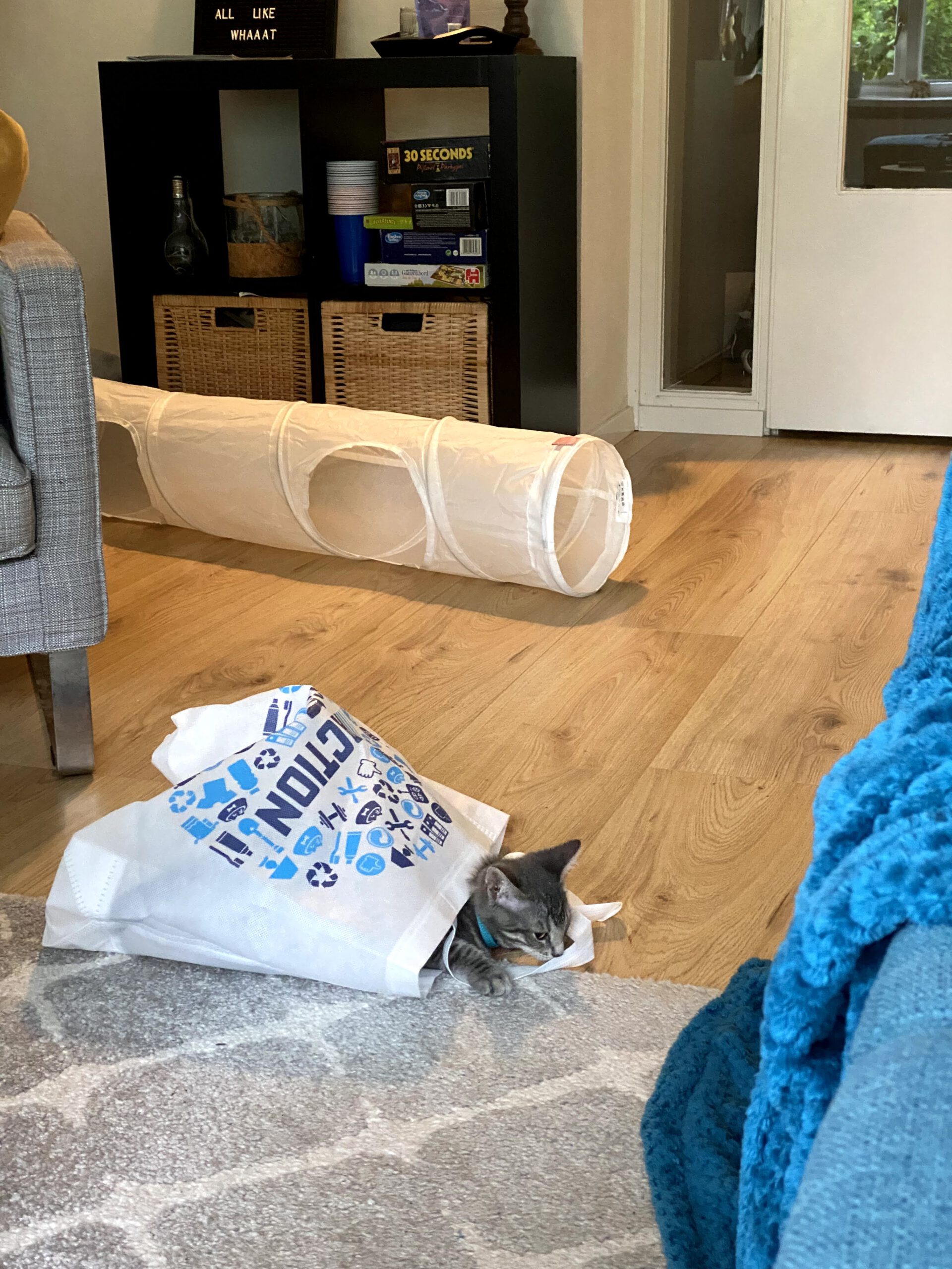 Het leven met een kitten kan een behoorlijke uitdaging zijn. Toch kan ik nu al niet meer zonder ‘m. Hij hoort me ’s ochtends opstaan en begroet me in de keuken met kopjes en gemiauw (hij weet ook dat hij eten krijgt). Hij leert nu de aluminiumballetjes naar me terug te brengen als een soort hond en als hij als een vliegende trapeze over zijn speeltunnel schiet, moet ik hard om ‘m lachen.
