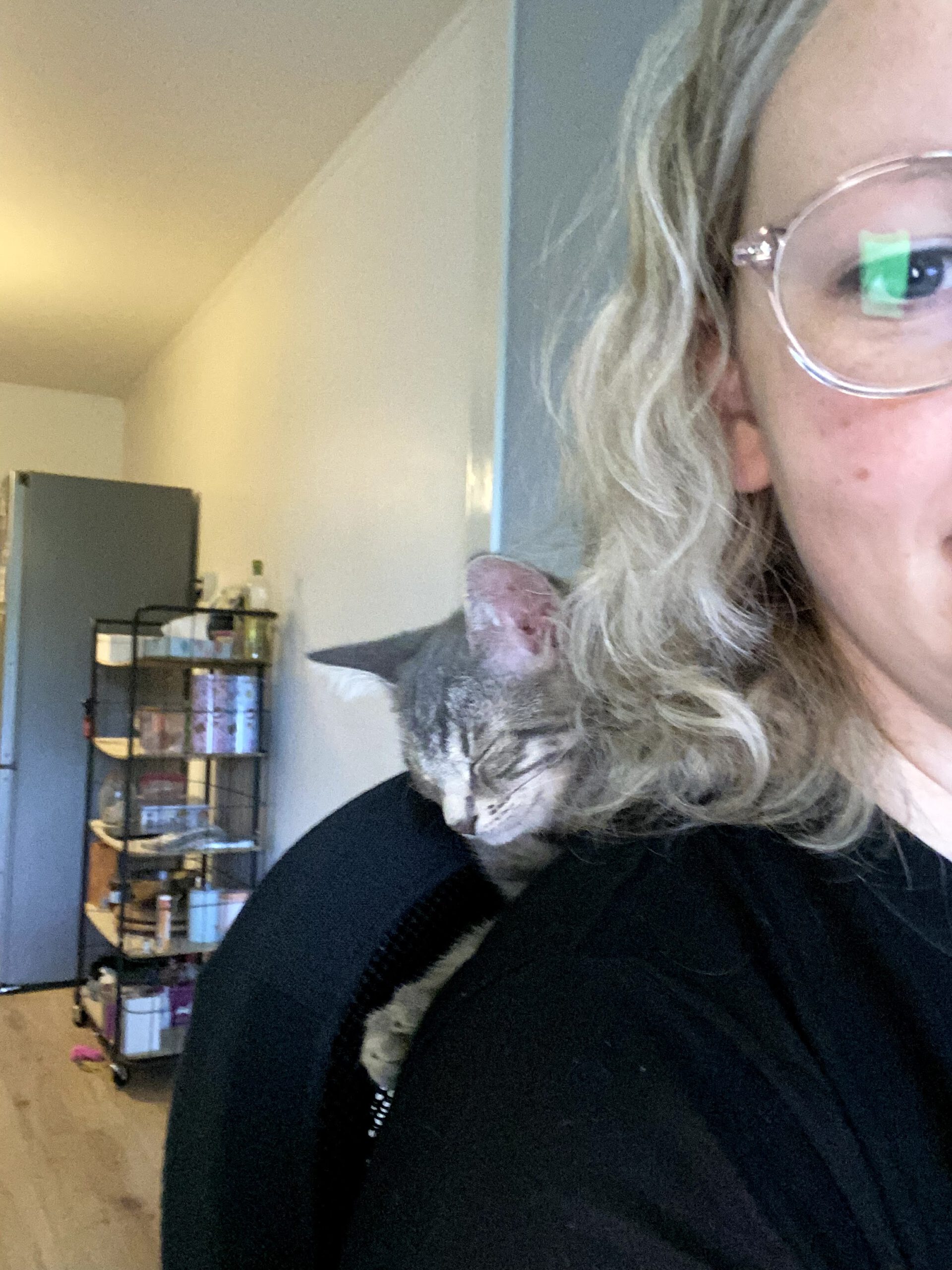 Nou, toen vond de kat dat ‘ie er ook moest zitten. Hij klom via mijn been omhoog naar m’n schoot, probeerde achter mijn rug te komen en dook later dan maar in mijn nek. En als dit allemaal gebeurt terwijl je een serieus telefoongesprek probeert te voeren, is dat best een uitdaging.