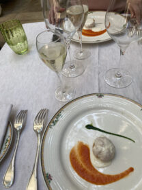 Het zweet komt overal vandaan, zelfs uit mijn armen. Met een vies gezicht veeg ik mezelf een beetje af met een servet. Dankbaar bestellen we een fles water. Als de obers langskomen met voor ons allebei een glas champagne en een amuse van een soesje met gelei kijken we elkaar aan. ‘Volgens mij is dit best een luxe tent,’ zeg ik tegen Inge. Zodra we de menukaart openklappen, wordt dat nog eens verder bevestigd.