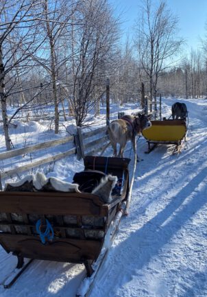 De volgende dag gaan we met een deel van de groep naar een rendierboerderij. We mogen meteen twee aan twee in de rendierslee stappen en krijgen uitleg hoe de slee te besturen. Ons rendier is Piero, die volgens de eigenaresse heel goed weet wanneer er toeristen in de slee zitten.