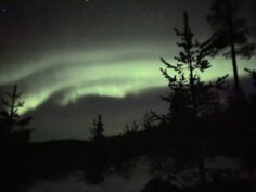 Uit het niets stopt onze gids en zet z’n sneeuwscooter uit. We staan midden in het bos. Als we omhoog kijken, begrijpen we waarom. Het noorderlicht is zó goed te zien, dat we ademloos omhoog kijken. In stilte kijken we een paar minuten naar het felle, groene lint boven ons. Dit is nog specialer dan de andere avonden waarop we het licht een beetje zagen. Nu verandert het lint constant van heel fel en een rechte streep naar gekrulde, groene linten.